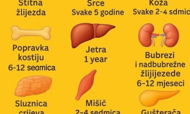 Moždano/nervno tkivoTraje 1–12 godinaNeke od najsporijih regeneracija, ali da, dešava se – posebno u hipokampusu!SrceRegeneriše …