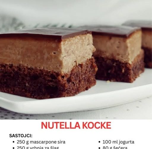 Ako postoji kolač koji je u stanju istovremeno probuditi osjećaj djetinjstva i luksuznog užitka, to su zasigurno Nutella kocke. Ovaj desert savršeno spaja bogatstvo čokolade, kremastost mascarpone sira i prepoznatljivu aromu prženih lješnjaka. Svaki sloj ovog kolača ima svoju ulogu – mekani biskvit čini osnovu, nježna krema pruža raskoš i punoću, dok sjajni čokoladni ganache zaokružuje cijelu priču elegantnim završetkom.