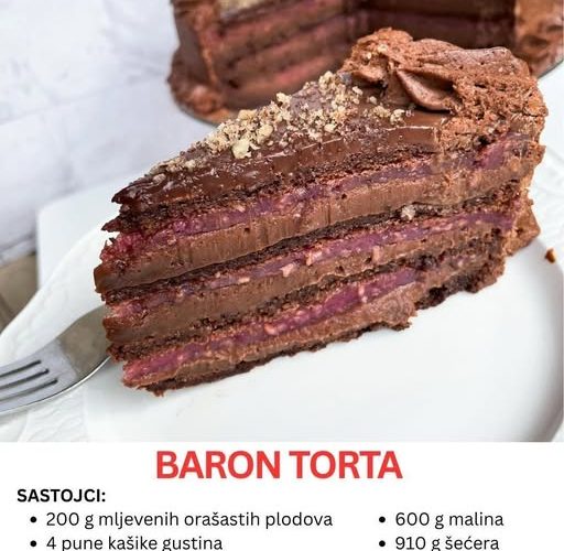 Baron torta nije obična torta – to je desert koji se pamti, koji se ne jede žurno, već polako, u tišini, dok se svaka nota ukusa topi na jeziku. Sastoji se od četiri čokoladne kore, bogatog čokoladnog fila i neodoljivog voćnog sloja od malina, koji unosi svježinu i kontrast. Ono što je posebno privlačno jeste to što svaka komponenta može da se prilagodi – od vrste orašastih plodova do jačine čokoladnog ukusa.