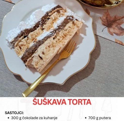 Ova torta je simbol finog balansa između hrskavog i kremastog, između laganog bjelančevog sloja i gustog, bogatog fila od čokolade i lješnjaka. Nije riječ o brzom desertu koji se priprema usput – naprotiv, Šuškava torta zahtijeva vrijeme, pažnju i osjećaj za detalj, ali se zato svaki zalogaj pretvara u pravo iskustvo ukusa i teksture.
