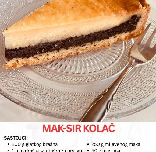U svijetu domaćih kolača, posebno mjesto zauzimaju oni koji spajaju tradicionalne sastojke sa slojevitom teksturom i uravnoteženim okusima. Jedan od takvih deserata je mak–sir kolač, kolač koji u sebi objedinjuje prhko tijesto, aromatičnu mak-smjesu i nježnu, kremastu sirnu podlogu. Ovaj kolač nije samo slastica – on je pravi primjer kako se jednostavni sastojci mogu pretvoriti u bogat i elegantan desert koji jednako dobro pristaje uz porodični ručak, popodnevnu kafu ili svečanije prilike.