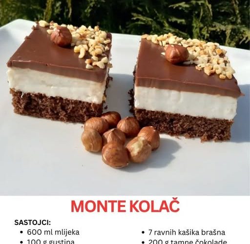 Njegova čarolija leži u jednostavnosti pripreme, ali i u savršenom spoju tekstura i okusa. Nježan i lagan, a opet pun intenzivnog čokoladnog doživljaja, Monte kolač je omiljeni izbor za porodična okupljanja, rođendane ili dane kada jednostavno želite uživati u desertu koji podsjeća na djetinjstvo.