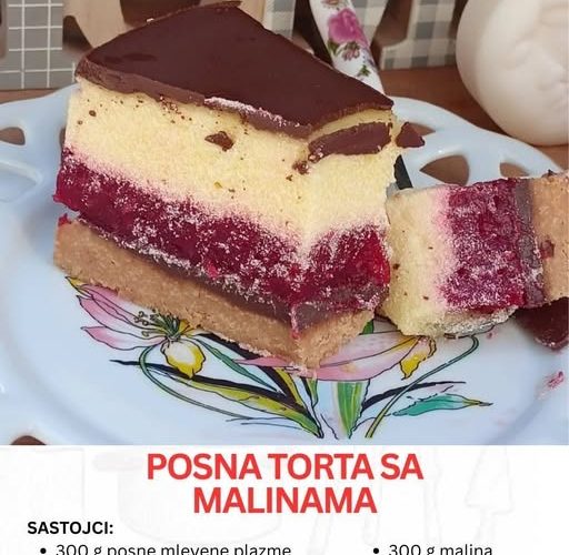 Zamislite tortu koja spaja osvežavajuću voćnu aromu malina, kremastu nežnost vanile i raskošnu završnicu od čokolade. Torta koja je u isto vreme lagana, osvežavajuća i elegantna, a pri tom posna, pa pogodna i za dane posta ili za one koji žele nešto bez mlečnih proizvoda. Upravo takva je posna voćna torta sa malinama.