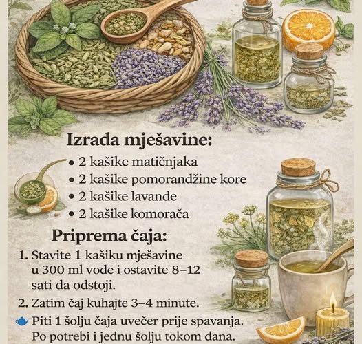 Napravite mješavinu od 2 kašike matičnjaka, pomorandžine kore, lavande i komorača. Kašika te mješavine se stavi u 300 ml vode i ostavite 8-12 sati da odstoji, a onda kuhajte 3-4 minuta. Pijte jednu kašiku dnevno i uvečer prije spavanja.