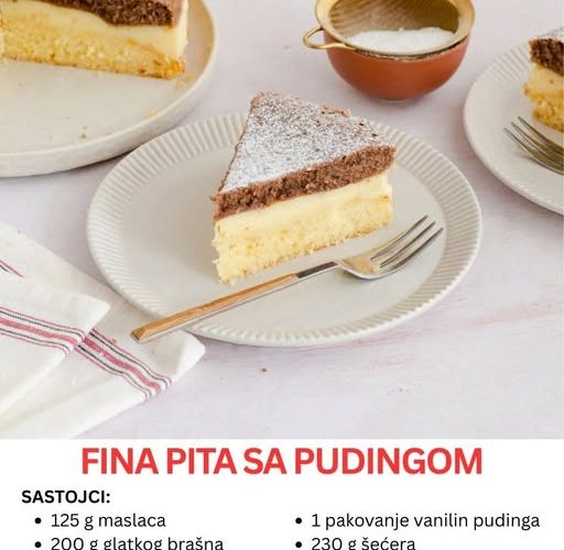 U svijetu domaćih kolača postoji nekoliko recepata koji ne izlaze iz mode. Jedan od takvih je upravo ova fina pita s pudingom, desert koji spaja mekani biskvit, svilenkastu kremu i blagi sloj kakaa, stvarajući harmoniju okusa i tekstura. Ono što ovu pitu čini posebnom jeste njena jednostavnost u pripremi i svestranost – može se poslužiti uz kafu, čaj, ili kao elegantan desert nakon večere.