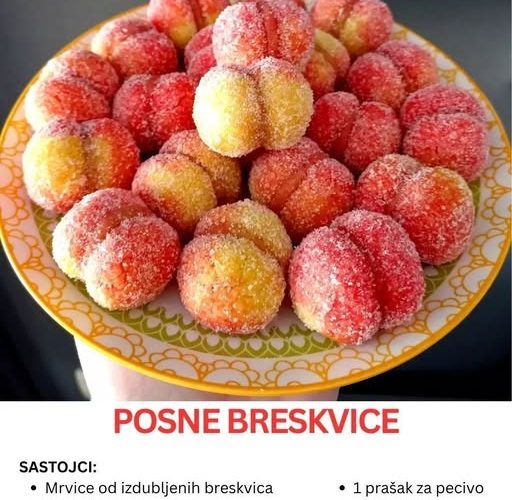 Postoje kolači koji ne osvajaju raskošom, nego toplinom i nostalgijom. Breskvice, te male šarene kuglice koje podsjećaju na voćke s bakine trpeze, upravo su takav desert. Njihova nježna struktura, zavodljiva aroma i savršena kombinacija boja stvaraju osjećaj doma, mira i jednostavne radosti. Još kada su posne, kao u ovom receptu, postaju pravi dokaz da se i bez mliječnih proizvoda može napraviti desert koji osvaja srca i nepca.