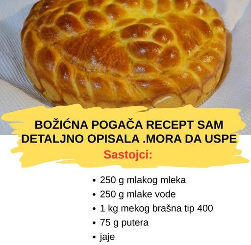 Sada preostala dva valjka razvaljajte na takvu dužinu, da kada se uviju jedan oko drugog, budu dovoljno dugački da naprave krug oko pogače iliti, trebate dobiti upletene valjke obima kružnice čiji je poluprečnik 14 cm iliti 87,92 cm Jednostavnije, napravite svaki valjak takve dužine da za nekih 10 cm bude duži nego koliko vam je potrebno da se zatvori krug u šerpi, pa će to na kraju biti dobro Dakle, kada ste razvaljali zadnja dva valjka, uvijte ih jedan oko drugog, stavite na ivicu pogače, spojite ih na krajevima da se spoj što manje vidi, pa malo, nežno, ugurajte uz ivicu šerpe, da ne ostanu baš samo na površini, kako bi čvršće stajali. Ostavite sada pogaču da naraste, nekih pola sata.