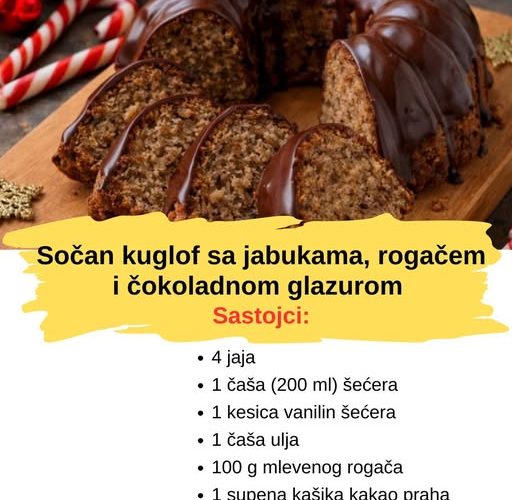 Ovaj domaći kuglof sa jabukama i rogačem je mekan, aromatičan i bogatog ukusa. Kombinacija cimeta, kakaa i rendanih jabuka daje mu posebnu sočnost, dok čokoladna glazura zaokružuje desert i čini ga savršenim za posluženje uz kafu ili čaj. Kolač je jednostavan za pripremu, a uspeva svaki put.