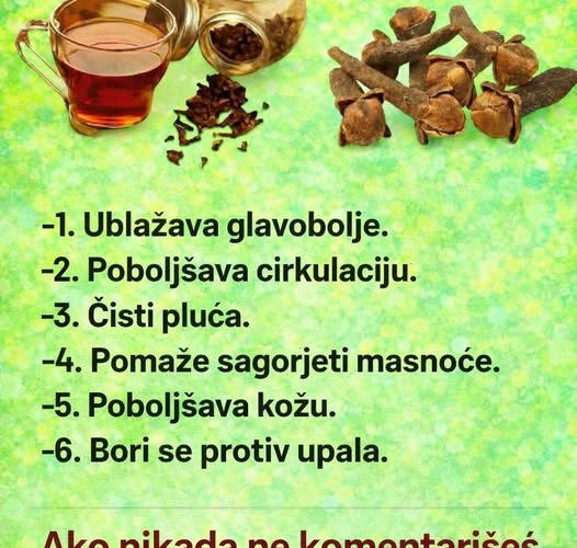 2 do 3 klinčića preliti sa 2,5 dl ključale vode, poklopiti, ostaviti da odstoji 15 minuta i procijediti.