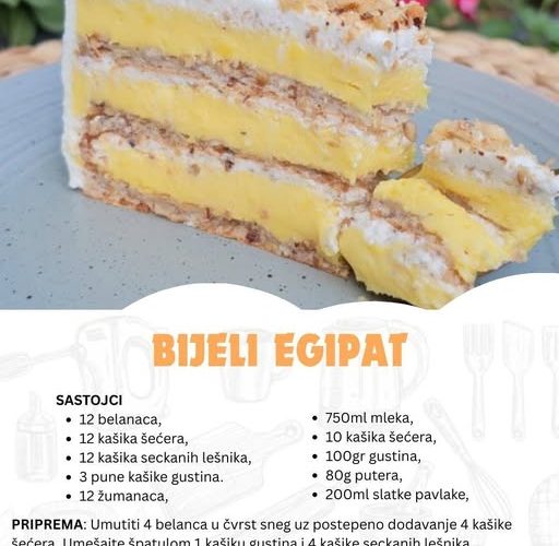 Beli Egipat torta predstavlja istinski specijalitet za sve ljubitelje kremastih i bogatih poslastica. Ova torta je sastavljena od tri savršeno pečene kore, koje su pažljivo prožete dvostrukim filovima – laganim i sočnim, sa notama bele čokolade i hrskavih lešnika. Njena kompleksna tekstura i harmonični ukusi čine je neodoljivim izborom za sve posebne prilike ili trenutke kada želite da impresionirate svoje ukućane i goste.