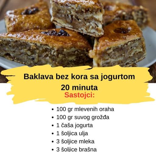 Baklava bez kora sa jogurtom je starinska poslastica koja se često nalazila na prazničnim trpezama kod nas. Oko 45 minuta je potrebno da je napravite, ali trud će se sigurno isplatiti, uverićete se i sami kada je probate!