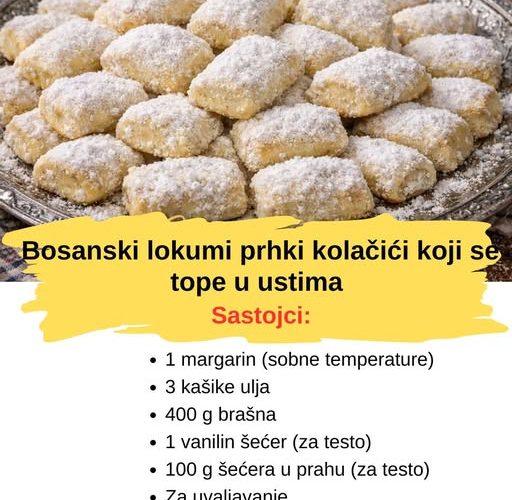 Bosanski  lokumi su jedan od najjednostavnijih i najmirisnijih sitnih  kolača: prhki, mekani, nežni i uvek “nestanu prvi”. Prave se od nekoliko sastojaka koje skoro svi već imaju kod kuće, a najveća tajna je pečenje na nižoj temperaturi – tako lokumi ostaju svetli, fini i topivi. Dok su još vrući, uvaljaju se u  šećer u prahu sa vanilom i dobiju onaj prepoznatljiv, praznični miris.