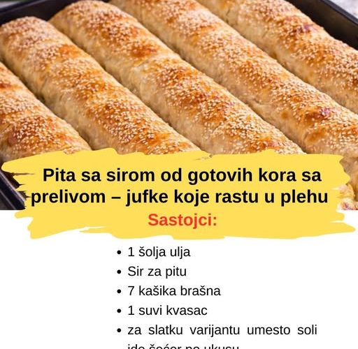 Ako volite brzu pitu sa sirom, ali da bude posebna, mekana i “kao domaća”, ovaj recept je pun pogodak. Pravi se od gotovih kora, a tajna je u prelivu sa kvascem koji omekša kore i napravi jufke vazdušnim. Nakon slaganja, pita odstoji sat vremena, naraste u plehu i peče se do zlatne boje. Savršena je za doručak, večeru, goste, a možete je lako napraviti i u slatkoj varijanti.