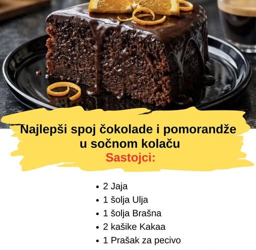 Dok se kolač peče, pripremite čokoladni preliv. Otopite čokoladu na pari i dodajte sok od pomorandže, mešajući dok ne dobijete glatku smesu. Kada se kolač ohladi, prelijte ga čokoladnim prelivom i ukrasite kriškama narandže i rendanom korom narandže za dodatnu aromu.