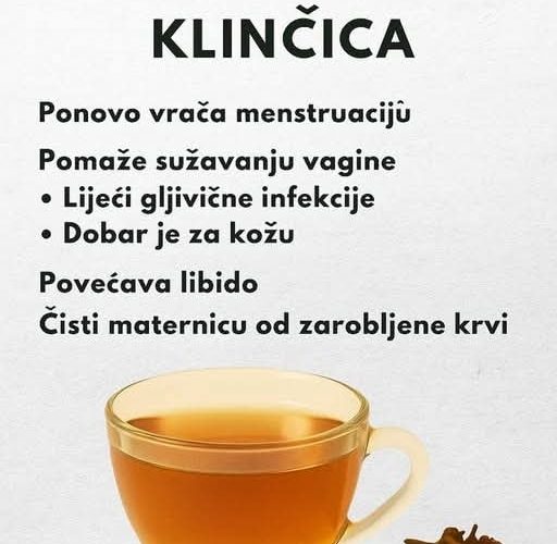 Čaj od klinčića je prirodni napitak koji se vekovima koristi u tradicionalnoj medicini različitih kultura. Priprema se od osušenih pupoljaka klinčića, poznatih po svom jakom mirisu i bogatstvu eteričnih ulja. Na slici vidimo topao čaj od klinčića, koji se često povezuje sa brigom o opštem zdravlju i ženskom dobrobiti.