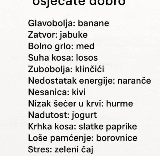Svi imamo dane kada nam tijelo šalje signale da mu treba podrška — bilo da nas boli glava, imamo problema sa spavanjem ili jednostavno osjećamo umor. Hrana može biti naš prvi i najprirodniji lijek. Od svježeg voća i povrća do začina i čajeva, mnoge namirnice pomažu da se tijelo oporavi i ponovo vrati u ravnotežu.