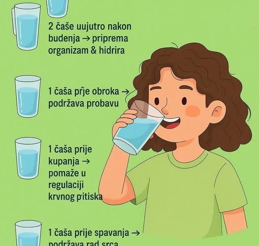 Prije spavanja: Jedna čaša vode prije odlaska na spavanje pomaže srcu i održava hidrataciju tokom noći. Ovo je posebno važno za osobe koje imaju problema sa bubrezima ili žele očuvati ravnotežu tečnosti u tijelu.