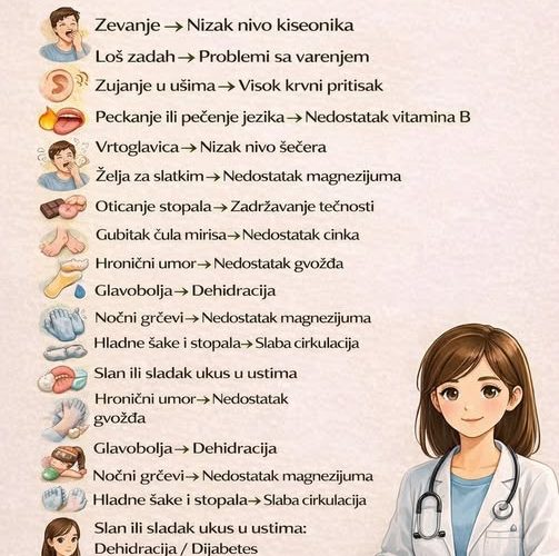 Naše tijelo stalno komunicira s nama, često putem malih znakova koje obično ignorišemo. Slika ističe uobičajene signale upozorenja koji ukazuju na nutritivne nedostatke, dehidraciju, probleme s cirkulacijom ili osnovne zdravstvene probleme. Rano razumijevanje ovih znakova može pomoći u sprječavanju ozbiljnih stanja i poboljšanju općeg blagostanja.