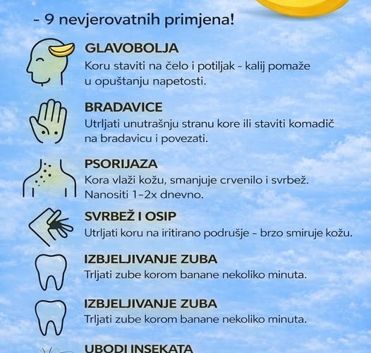 Glavobolja – Banane su bogate kalijem, tako da bi trebalo staviti koru preko čela, i stražnji dio vrata za ublažavanje glavobolje.