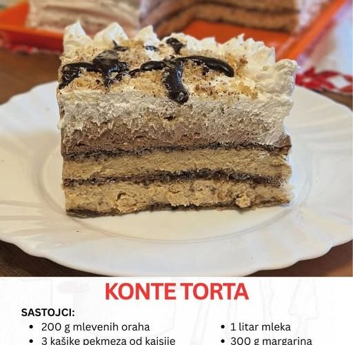 U svetu poslastica postoje deserti koji se rado prave zbog jednostavnosti, ali i oni koji svojom raskoši osvajaju i izgledom i ukusom. Konte torta nesumnjivo pripada ovoj drugoj kategoriji – ona je prava svečana poslastica, bogata različitim ukusima i teksturama, slojevita, kremasta i istovremeno lagana. Sama priprema možda deluje na prvi pogled zahtevno, jer se sastoji od više koraka, ali svaki od njih vodi ka konačnom rezultatu koji očarava svakog ko je proba.