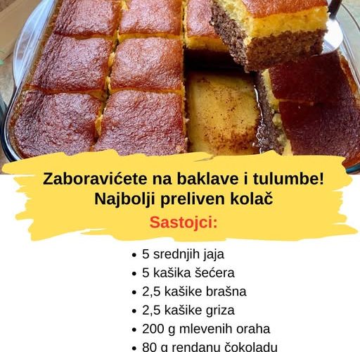 Za početak ćemo napraviti početno tijesto tako što ćemo uzeti 5 jaja i snažno ih umutiti u dubokoj posudi. Zatim u smesu ubacite 5 kašika šećera. Mikserom blendajte sastojke u trajanju od 8-10 minuta, ili dok se šećer potpuno ne otopi i postigne gusta, baršunasta konzistencija. U smesu postepeno unosite prosijano brašno, prašak za pecivo, griz, ekstrakt vanile i seckane orahe, pazeći da se lagano meša. Važno je održati pjenastu i prozračnu konzistenciju tijesta. Na kraju ubacite rendanu čokoladu, dobro sjedinite i prebacite smjesu u lonac srednje veličine koji je malo podmazan. Zagrejte rernu na 200 stepeni i pecite 10 minuta. Dok se prva kora peče, počnite sa pripremom druge kore. Druga kora ide po sličnom postupku pripreme, sa izuzetkom izostavljanja oraha i čokolade iz tijesta. Nakon što je odležao u rerni 10 minuta, izvadite ga i ravnomerno rasporedite žutu koru po vrhu. Smanjite temperaturu na 175 stepeni i nastavite sa pečenjem još 25-30 minuta. U međuvremenu počnite da kuvate sirup. Ostavite tortu sa strane nakon što je izvadite iz rerne. Nastavite tako što ćete topli kolač preliti šerbetom koji se kuha na pari.