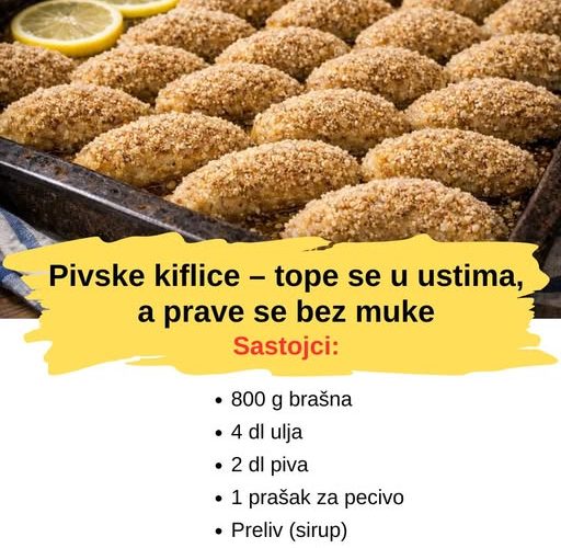 Pivske kiflice su stari, provereni kolač koji uvek uspeva – prhke, lagane i neverovatno mekane, a pritom se prave od jednostavnih sastojaka. Pivo u daje posebnu rastresitost i onu “topi se u ustima” teksturu, bez da se oseća ukus piva. Posle pečenja kiflice se prelivaju toplim sirupom sa kolutovima limuna (po želji i vanilom), pa se odmah uvaljaju u mlevene orahe. Rezultat je mirisan, sočan i praznično bogat koji nestaje sa tanjira za čas.