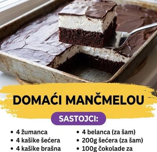 Domaći Mančmelou je prava poslastica koja kombinuje sočan kakao biskvit, vazdušasti šam sloj i bogatu čokoladnu glazuru. Njegova kremasta struktura i čokoladni ukus čine ga savršenim desertom za svaku priliku. U nastavku ćete pronaći detaljan recept kako biste ga mogli pripremiti tačno onako kako izgleda na slici.