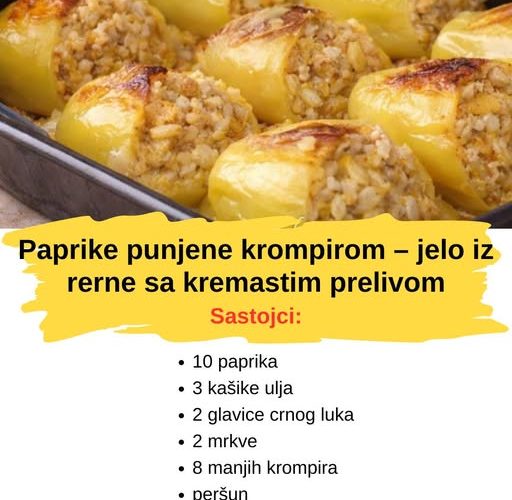 Paprike punjene krompirom su pravo domaće jelo „na kašiku“, iako se peku u rerni – mirisne, mekane i zasitne, idealne kada želite nešto jednostavno, a opet bogato ukusom. Fil od krompira, šargarepe i luka daje puninu, a kratko zapečen preliv od mleka i maslaca (ili margarina) napravi onaj fini, kremasti završetak zbog kojeg se traži repete. Odlične su za ručak, post, porodični sto i dane kada vam treba topao, utešan obrok.