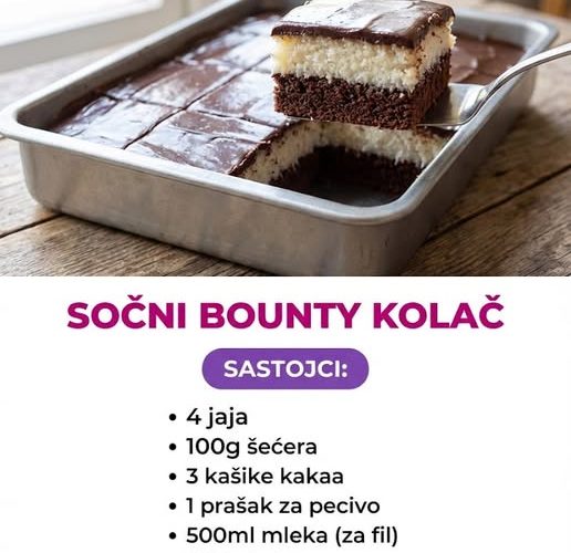 Uživajte u savršenom spoju kokosa i čokolade sa ovim sočnim Bounty kolačem. Ovaj recept je idealan za sve ljubitelje slatkiša koji traže desert koji će impresionirati goste i porodicu. Sočan, ukusan i jednostavan za pripremu, ovaj kolač će sigurno postati vaš omiljeni.