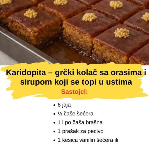 Karidopita je jedan od najpoznatijih tradicionalnih grčkih kolača. Ovaj sočan desert sa orasima, cimetom i karanfilićem preliva se aromatičnim sirupom od šećera i limuna, zbog čega svaka kriška ostaje mekana, mirisna i puna ukusa. Idealan je za praznike, slave, porodična okupljanja ili kada želite poseban kolač uz kafu.