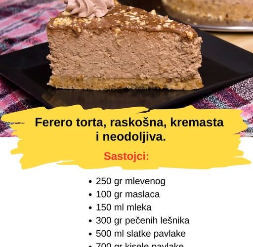 Idealna za svaku priliku. Brzo se pravi, kombinacija lešnika i obogaćena hrskavim napolitankama koje daju poseban ukus ovoj torti je ono što ferrero čini tako posebnim. Iznenadite svoje ukućane, obradujte svoje goste i jednostavno uživajte!