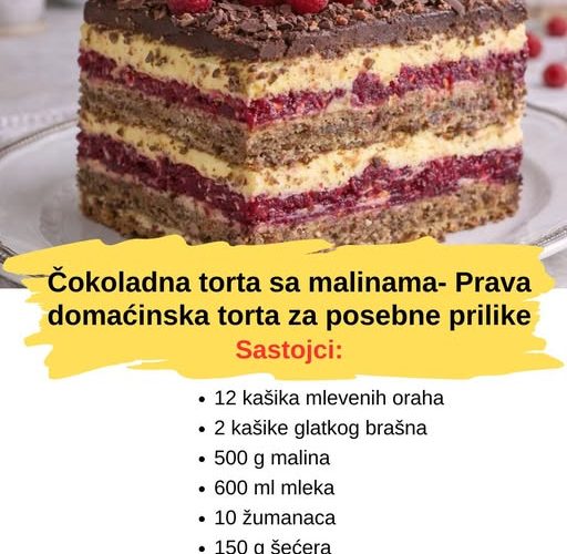 Ova torta je savršen spoj čokoladnih kora s orasima, kremaste vanilije i osvježavajućih malina. Bogata, sočna i elegantna – idealna za svečane trenutke.