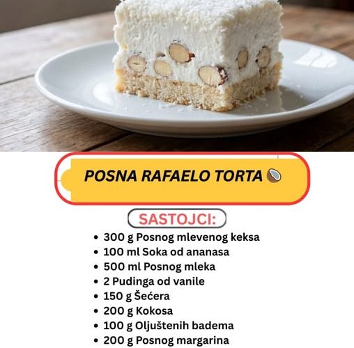 Kada su u pitanju poslastice koje obaraju sa nogu svojim nežnim ukusom i elegantnim izgledom, Posna Rafaelo torta je apsolutni favorit. Ovaj desert bez pečenja spaja osvežavajuću notu ananasa, hrskavost badema i bogatu kremu od kokosa, donoseći onaj prepoznatljivi, luksuzni ukus popularnih kuglica pravo na vašu slavsku ili prazničnu trpezu.