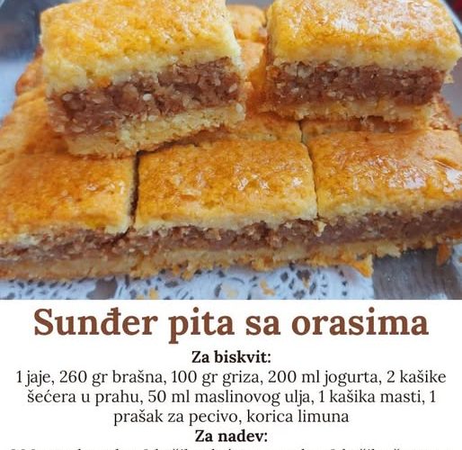Na foliju razvući veličinu pleha Preko donjeg dela u plehu staviti razvijen nadev od oraha a preko oraha drugi deo razvijenog testa. Poseći nožem na kocke i peći na 190 stepeni 45-50 min. . Pečen ponovo nožem iseći po sečenim delovima..