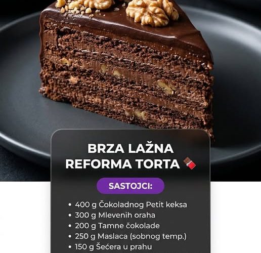 Brza lažna reforma torta je savršena poslastica za one koji žele bogat ukus čokolade i oraha bez komplikovane pripreme. Ova torta je vizuelno impresivna sa svojim slojevima i dekoracijom od oraha. Prava je poslastica za sve ljubitelje čokolade i idealna je za svaku priliku.