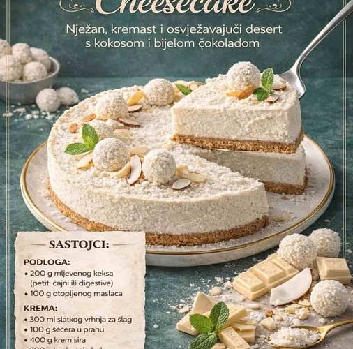 Površinu kolača možete posuti kokosovim brašnom, ukrasiti Raffaello kuglicama ili bijelom čokoladom.