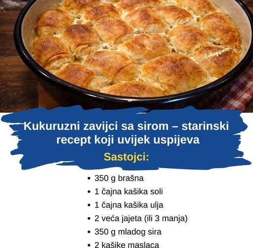Ako volite pite “kao nekad”, kukuruzni zavijci sa sirom su pravi pogodak: domaća jufka, sočan sirni fil i zlatna korica koja puca pod prstima. Ovaj starinski recept se pravi sa kukuruznim brašnom (ne griz za puru), a dodatak kajmaka i maslaca daje onaj bogat, domaći ukus zbog kog se uvijek traži još jedan zavijak.