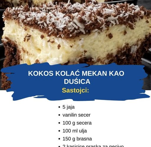 Kolač posuti kokosom ili naribanom čokoladom po želji. Ostaviti u frižideru barem 2–3 sata da se lijepo stegne, pa rezati na kocke.