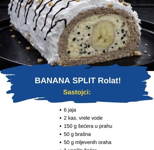 Svaki veliki počinje sa pravim testom. Kod banana split rolata, biskvit je lagan, elastičan i mirisan, zahvaljujući kombinaciji jaja, oraha i prstohvatu vanile.