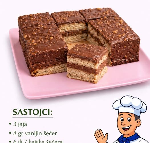 Sastojci:– 3 jaja– 8 gr vanilin šećer– 6 ili 7 kašika šećera– 100 ml ulje– 100 ml mlijeko– 12 kašika brašna (200 gr)– 12 gr prašak za .Fil:– 500 ml mlijeko– 4 kašike šećera– 2 kašike kakaa– 2 kašike brašna– 50 gr margarin– 6 kašika mljevenog keksa.Glazura:– 200 ml slatka pavlaka– 180 gr čokolada za kuhanje– 50 gr orasi.