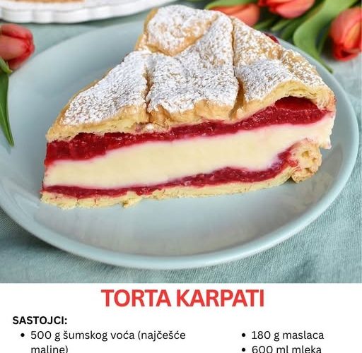 Ovaj recept je idealan za sve prilike – bilo da pripremate tortu za rođendane, praznične trpeze ili porodična okupljanja, Torta Karpati će uvek biti zvezda stola. Ono što je posebno kod ove torte jeste kombinacija hrskavih, a opet mekih kora sa kremastim i voćnim slojevima, što je čini i vizuelno privlačnom i izuzetno ukusnom.