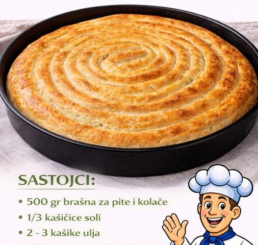 Priprema: Zamijesiti mekano i glatko tijesto od brasna, soli, ulja i vode. Podijeliti na pola (jufke 400 gr) i premazati puterom, pokriti celofanom i ostaviti da odstoji na toplom dok spremamo nadjev.