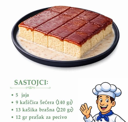 Priprema: Jaja i šećer sipati u činiju i dobro umutiti mikserom, a potom dodati brašno i prašak za pecivo i promešati žicom. Dobijenu smesu izliti u podmazan preh i peći, u prethodno zagrejanoj rerni na 250 stepeni, i peti prvih pet minuta na toj temperaturi, a potom narednih oko 25 na 180 stepeni, ali obavezno pratiti da se ne prepeče.