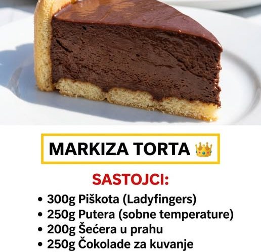 Kada želite da napravite desert koji izgleda apsolutno luksuzno, a zapravo se priprema neverovatno jednostavno i bez paljenja rerne, Markiza torta je recept koji morate imati u svom kuvaru. Ova klasična poslastica poznata je po svojoj elegantnoj “kruni” od piškota i neopisivo bogatom, penastom čokoladnom filu koji podseća na najfiniji francuski mus. Idealan je izbor za rođendane, praznike ili svečane nedeljne ručkove, jer njen presek i tekstura koja se topi u ustima nikoga ne ostavljaju ravnodušnim.