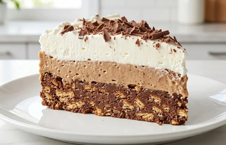 Na slici vidimo taj savršeni, neodoljivi trenutak kada se metalnom špatulom pažljivo podiže jedan predivno isečen komad torte pravo ka kameri, otkrivajući nestvarno jasan i privlačan presek: tamna, stabilna i neverovatno bogata osnova puna komadića Plazma keksa i čokolade, preko koje se uzdiže tanji, svetlo-smeđi kremasti sloj, dok je sam vrh raskošno krunisan debelim slojem snežno bele umućene slatke pavlake i posut krupnim strugotinama tamne čokolade koje mame na prvi zalogaj.