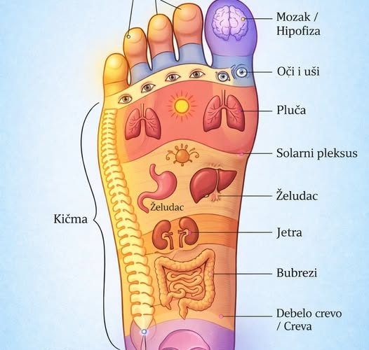 Krećući se niz stopalo, mapa vas vodi kroz tjelesne sisteme: gornji luk povezan je s plućima i tačkom smirivanja solarnog pleksusa, dok srednji dio stopala pokriva vitalne organe poput jetre, želuca i bubrega. Donji dio i peta povezani su s crijevima, išijadičnim živcem i reproduktivnim sistemom.