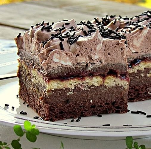Biskvit, pola smjese od čokoladne kreme, petit keksi namočeni u mlijeko i poredani po kremi. Četiri pune žlice pekmeza (marmelade) od aronije malo izmješajte u posebnoj zdjelici da se lakše razmazuje. Premazati pekmez preko petit keksi, i na to lagano rasporediti ostatak čokoladne kreme.