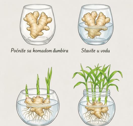 Svježi komad korijena đumbira iz trgovine u čaši vode će pustiti korijenje u roku od dvije sedmice i izdanke u roku od tri do četiri. Nije potrebna zemlja, posebna oprema, niti iskustvo u vrtlarstvu. 🌿