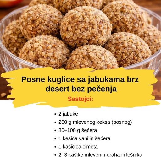 Posne kuglice sa jabukama su savršen izbor kada želite lagan, domaći i ukusan desert bez pečenja. Prave se brzo, od jednostavnih sastojaka, a zahvaljujući jabukama i orasima imaju prirodnu sočnost i prijatan, blago kiselkast ukus.