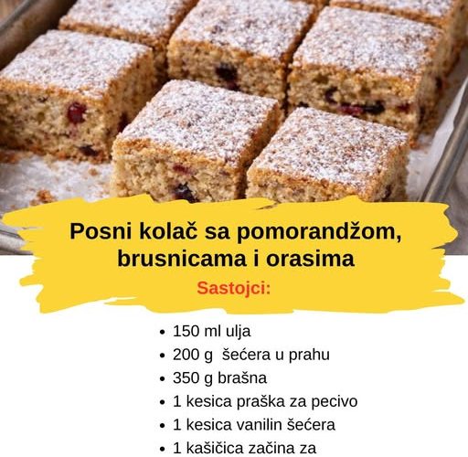 Ako tražite jednostavan, sočan i mirisan posni , ova kombinacija pomorandže, brusnica i oraha je pun pogodak. Citrusna nota daje osvežavajući ukus, brusnice unose blagu voćnu kiselkastu notu, dok orasi kolaču daju punoću i domaću aromu. Ovaj recept je odličan za dane posta, ali i za sve koji vole lagane kolače sa bogatim mirisom i mekanom teksturom.